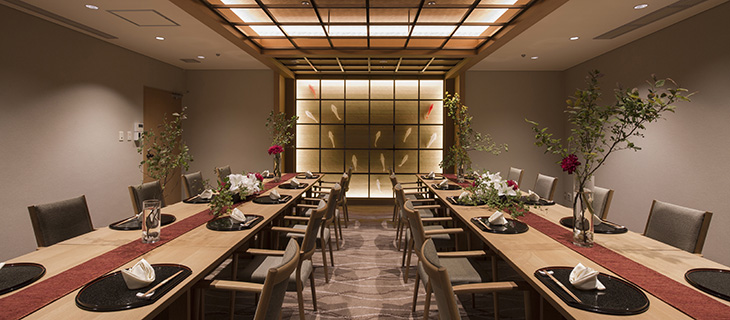 2つの特別個室、瀬戸内海の水面のやわらかさを意識した「高砂」と、中国山地の四季をイメージした「相生」には、飛騨のオーク材を用いたテーブルと肘掛け付きの椅子を採用しました。