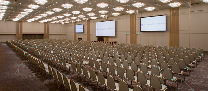 広島で最大級の規模を誇る大宴会場。1,010平方メートルのスペースに、音響、照明設備などの機能も充実。