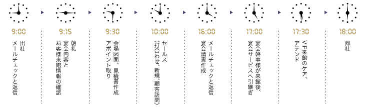 ご成約いただいた後は、クライアントとの打合せやホテル内の調整を重ね、ご宴会当日のお迎えからお見送り、さらには次回ご利用いただく機会がないかどうかもお尋ねし、ご縁を切らさぬように心がけています。今は一人で年間300件くらいを手掛けています。