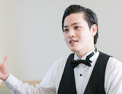 スカイレストランアンドラウンジ「L&R」で、接客を担当しています。L&Rは、開店から閉店までクローズタイムがなく、常に様々なゲストがいらっしゃいます。ランチタイムは主に女性グループ、ティータイムはビジネス利用の方、ディナーはカップルやご家族連れ、バーはパーティの2次会で利用される方が多いですね。接客において大切なことは「そのゲストが何を求めているか」をいち早く察知すること。ゆったり過ごしたいのか、それとも急いでおられるのか、ここでどんな時間を過ごされたいのかを的確に把握した上で、ホテルならではの洗練された行き届いたサービスができるよう心がけています。ゲストの目の前での料理の仕上げや切り分けなども、重要なパフォーマンスなのですが、優雅に行うのはなかなか難しくて…、いまはフランベを猛練習しています。