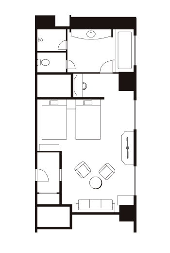| 客室備品 | 地上デジタル対応液晶テレビ(42型)/ 電話 / インターネット接続(無線・有線LAN形式) / 湯沸かしポット / 冷蔵庫 / ヘアドライヤー / ズボンプレッサー / 加湿機能付き空気洗浄機 / カプセル式コーヒーメーカー(無料)/ 目覚まし時計 |