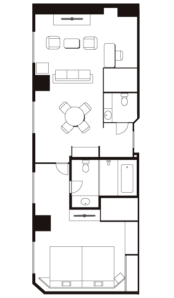 当ホテルでもっと広い74平米の広さを備えた室内は、ベッドルームとリビングダイニングスペースが分離。