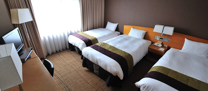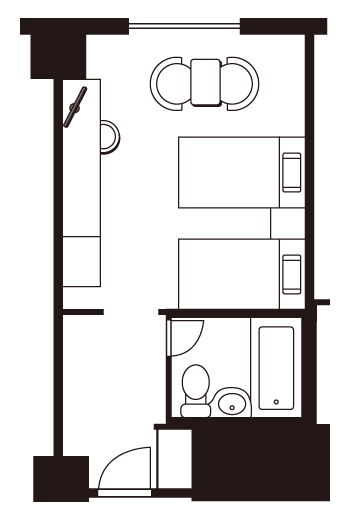 | 客室備品 | 地上デジタル対応液晶テレビ(26型)/ 電話 / インターネット接続(無線・有線LAN形式) / 湯沸かしポット / 冷蔵庫 / ヘアドライヤー / ズボンプレッサー / 清浄機付トイレ / 加湿機能付き空気洗浄機 / カプセル式コーヒーメーカー(無料)/ 目覚まし時計 |