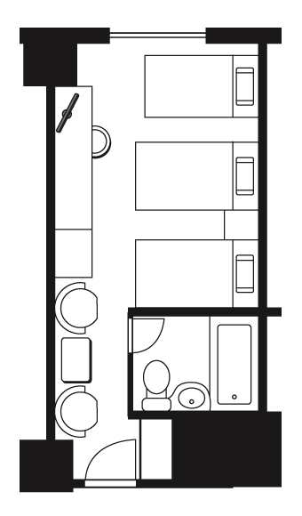 | 広さ | 26平米 | 3名利用 | スタッキングベッド使用 (7~9階、12階、17階) エキストラベッド使用 (10階・11階・14階~16階・18階) 1名・2名利用の詳細はこちら |