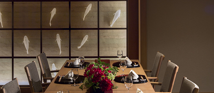 2つの特別個室、瀬戸内海の水面のやわらかさを意識した「高砂」と、中国山地の四季をイメージした「相生」には、飛騨のオーク材を用いたテーブルと肘掛け付きの椅子を採用しました。