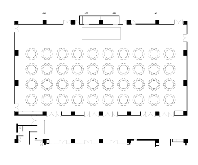 | その他 | 音響16ch入力、照明24chの移動ワゴン有り。全宴会場、ホワイエとコントロールルームに音響用、ビデオ用連絡回線有り。 |