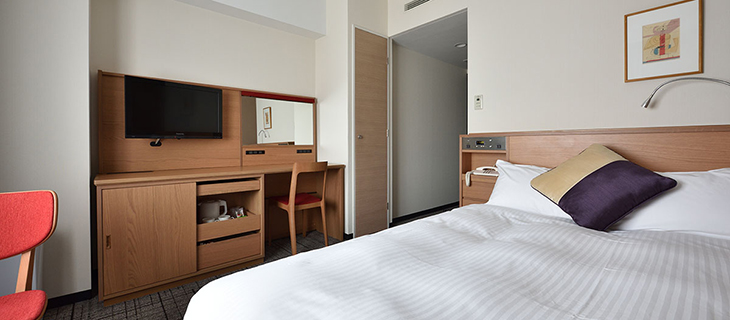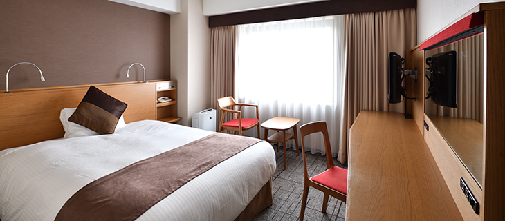 | 客室備品 | 地上デジタル対応液晶テレビ(26型) / 電話 / インターネット接続(無線・有線LAN形式) / 湯沸かしポット / 冷蔵庫 / ヘアドライヤー / ズボンプレッサー / 洗浄機付トイレ /空気清浄機(一部加湿機能付き) |